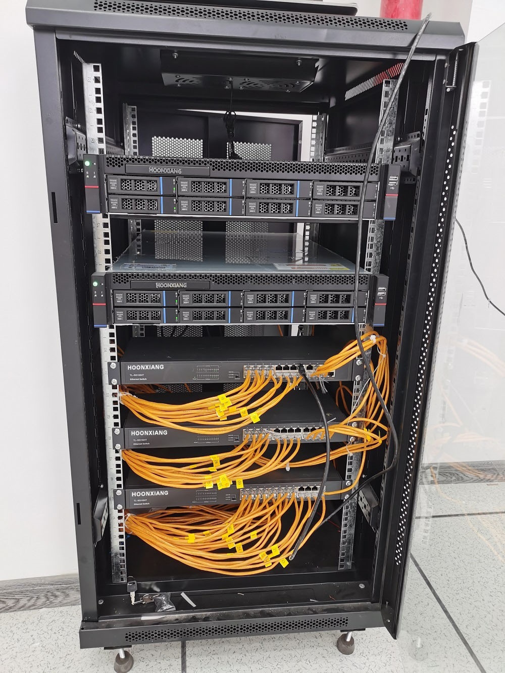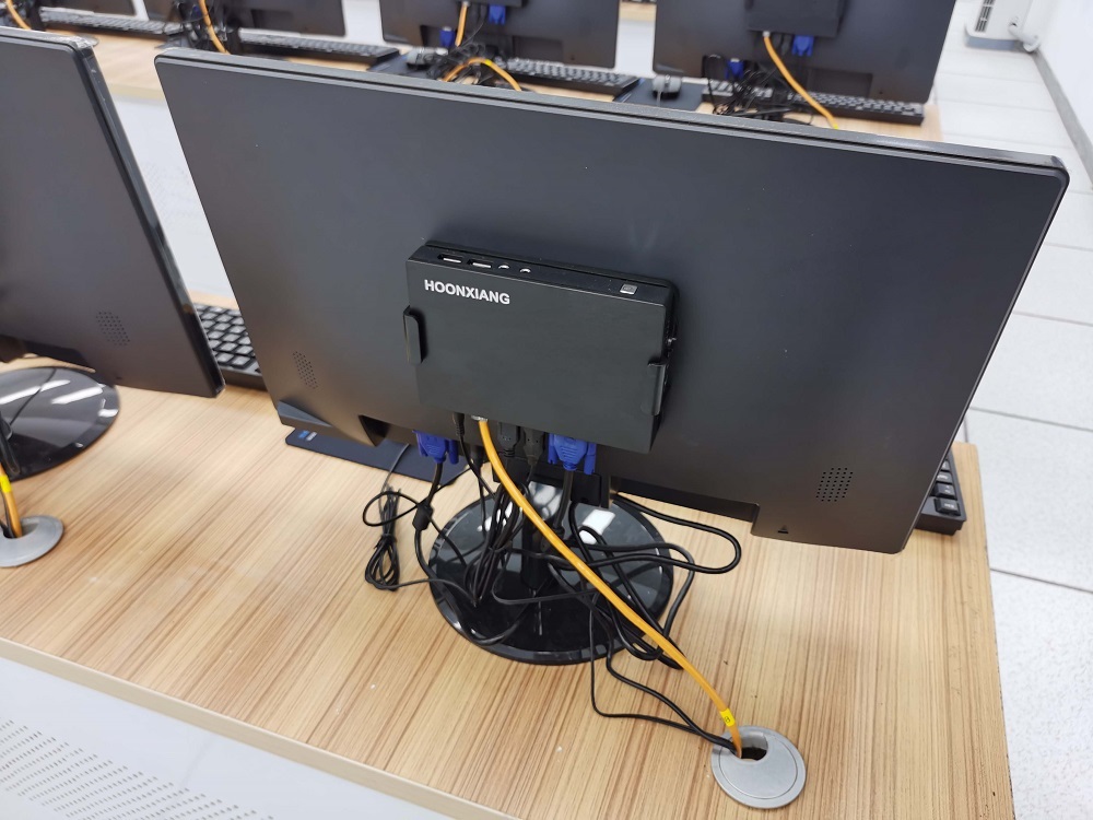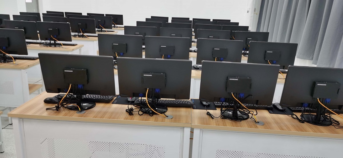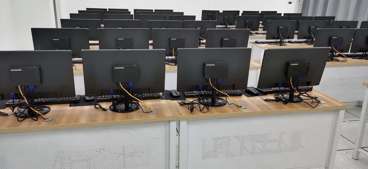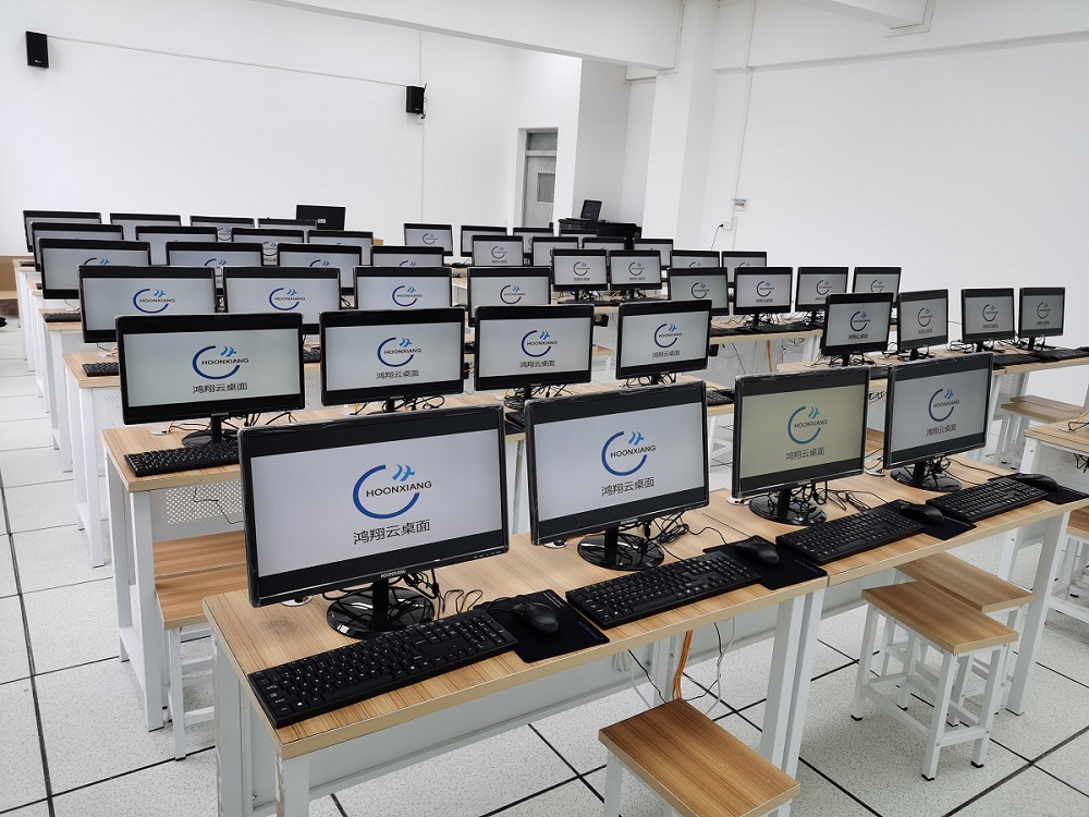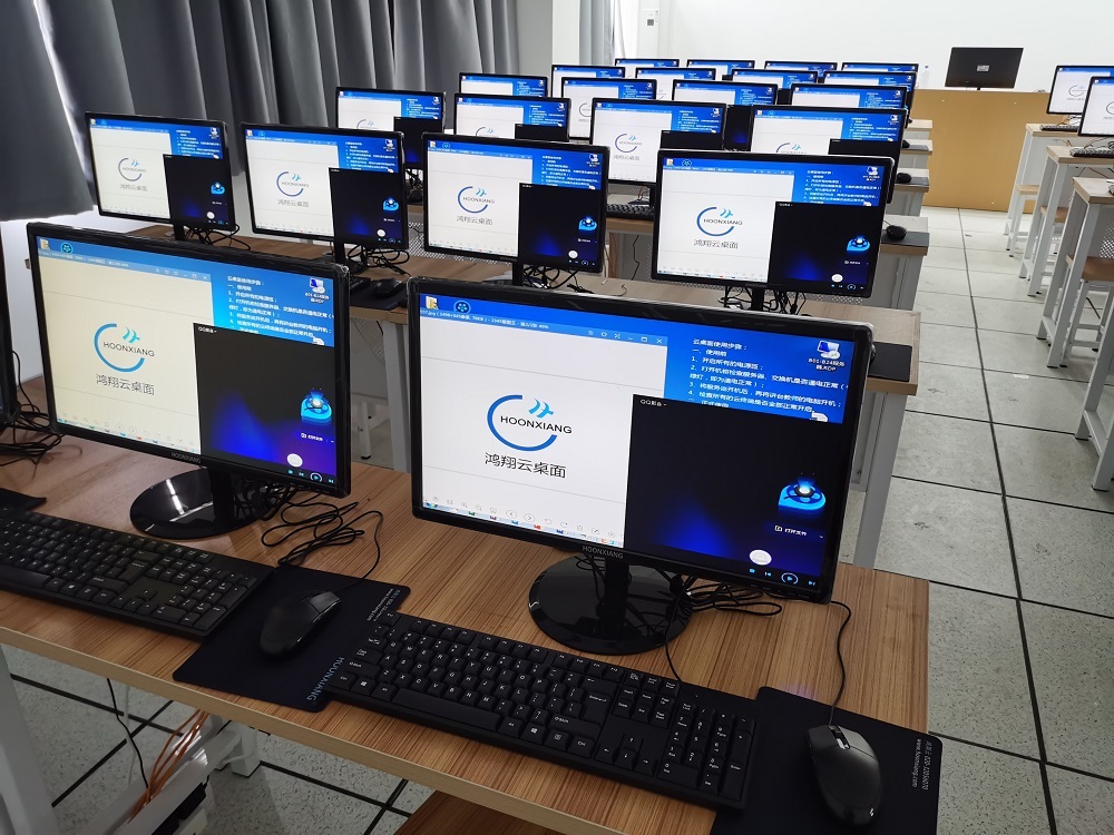 该学校使用了鸿翔云桌面整体解决方案部署了两个教室,每个教室有49台鸿翔云终端,一共98台鸿翔云终端;每间教室分别使用了两台鸿翔云服务器,三台鸿翔云24口全千兆交换机,49台鸿翔显示器,49套鸿翔键鼠套装,49张鸿翔鼠标垫,若干条六类网线。